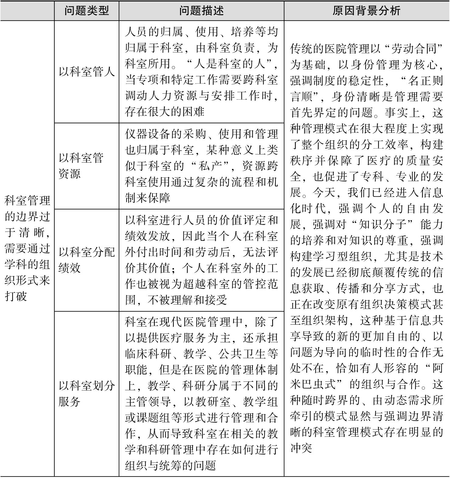 表1-4 从“科室”走向“学科”——主要问题和分析