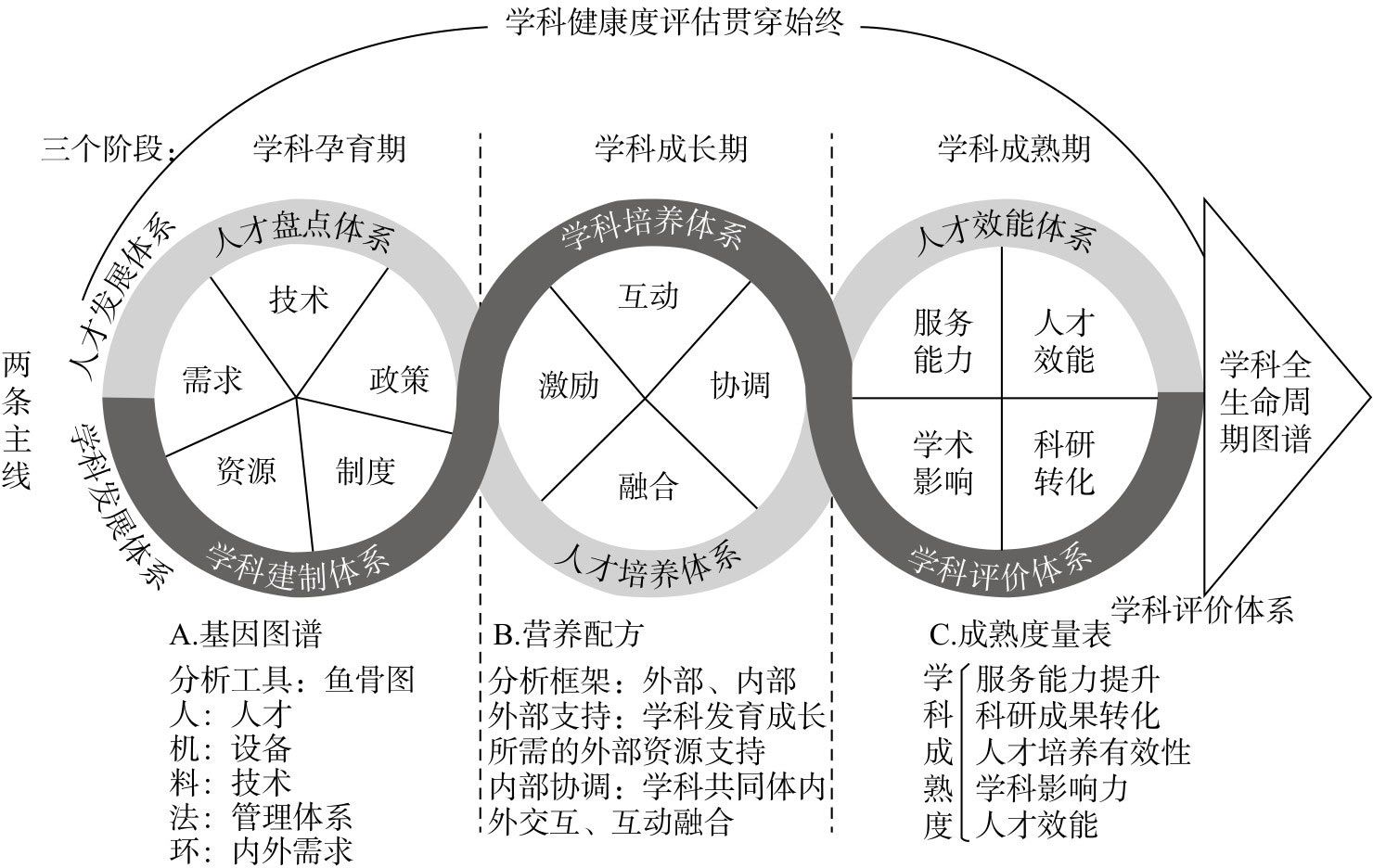 学科作为生命体,有着孕育、成长并不断成熟的科学规律。学科在成长过程中,有的可能先天不足,有的可能后天发育不良,既需要自身的不断努力,更需要外部的持续支持。从学科全生命周期图谱中可以看到,学科全生命周期有两条主线:一条是学科发展体系,包含学科建制体系、学科培养体系和学科评价体系;另一条是人才发展体系,包含人才盘点体系、人才培养体系和人才效能体系。两条主线交叉融合、彼此支撑,既是成因又是对策,在不同的发展阶段面临不同的治理主题和重点任务,可以通过基因图谱、营养配方、成熟度量表等工具抓手识别问题、制定对策,全程“体检”,对症下药。