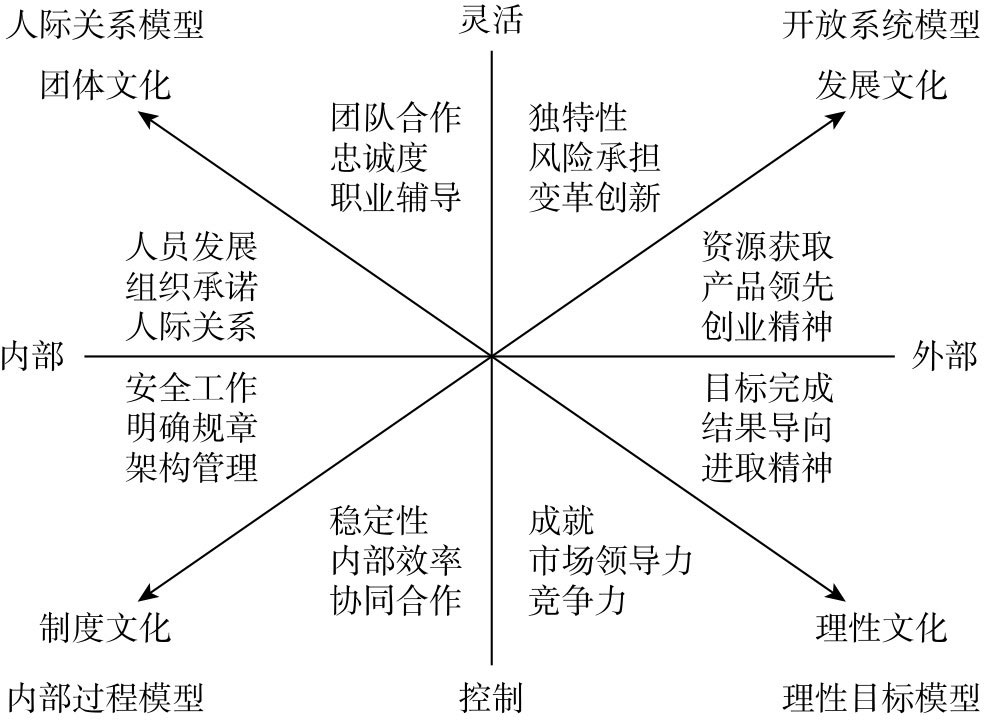 如图2-4所示,组织文化竞值架构的第一个价值维度为“内部—外部”,与组织关注有关,由从内部、微观的角度强调组织成员的福祉和发展,到从外部、宏观的角度强调组织本身的福祉和发展。第二个价值维度为“控制—灵活”,与组织结构有关,由强调组织的稳定性到强调组织的灵活性。