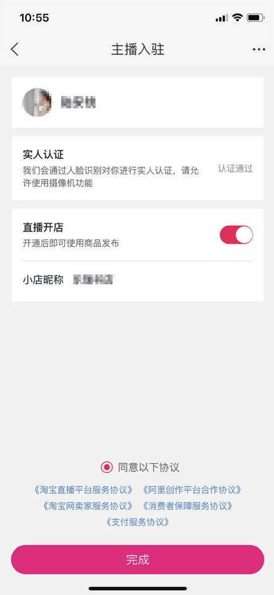 第2步 跳转至主播入驻页面,根据提示完成实人认证(面部识别确认为本人),点开“直播开店”按钮,设置店铺昵称,选中“同意以下协议”按钮,点击“完成”按钮,如图1-15所示。