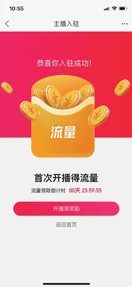 第3步 跳转至入驻成功页面,点击“开播领奖励”按钮,如图1-16所示。
