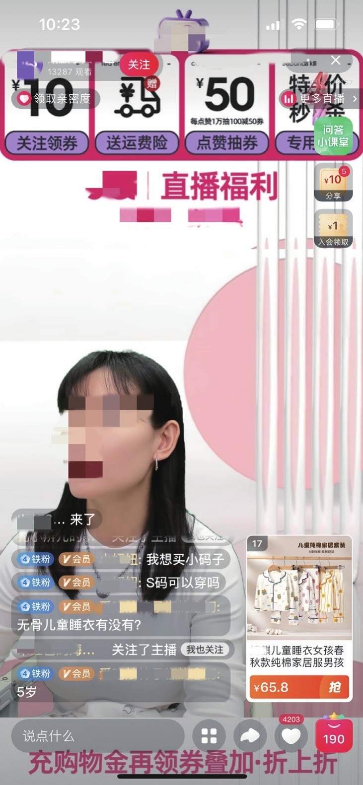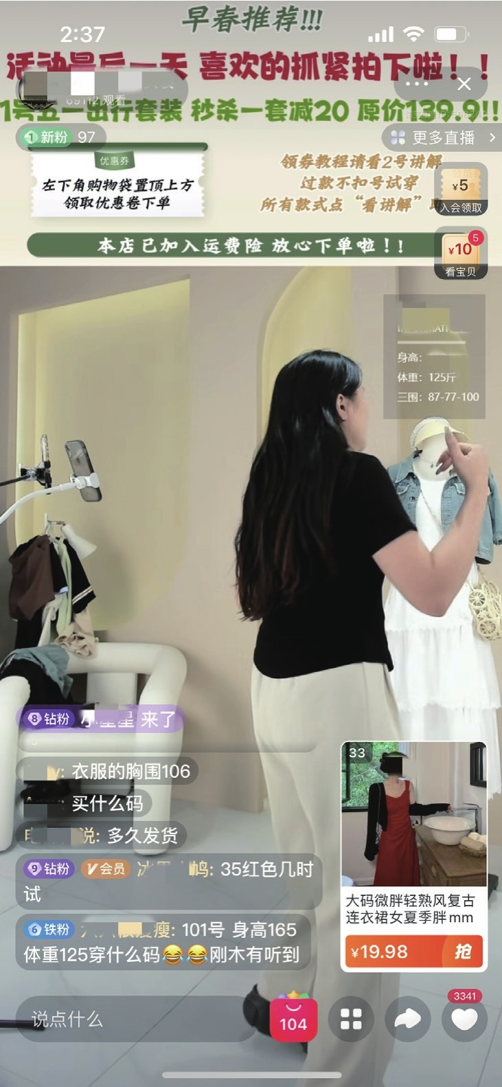 在直播间,用户可以直接向主播提出疑问,主播也可以及时给予回答。如图1-2所示,用户可以询问商品的尺码,主播也可以及时回答用户问题,比传统电商的互动性更强。同时,在直播间中还可以设置互动活动,如抽红包、抽奖、发优惠券等,增强用户的活跃度与参与感。