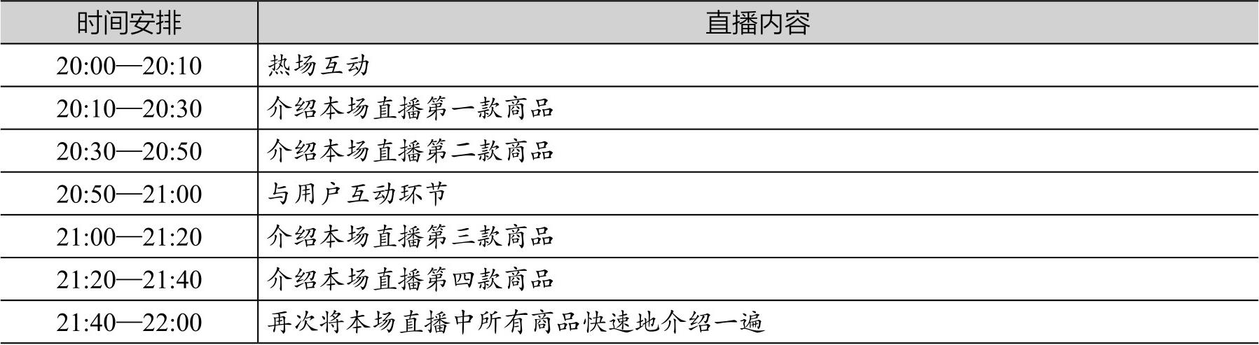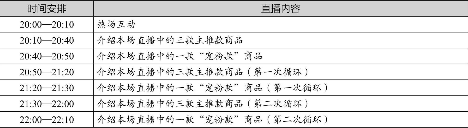 循环式直播是指在一定时间内,循环推荐几款主推商品,特别适用于商品种类少的直播间。例如,某直播间的循环式直播时间安排及直播内容如表1-3所示。