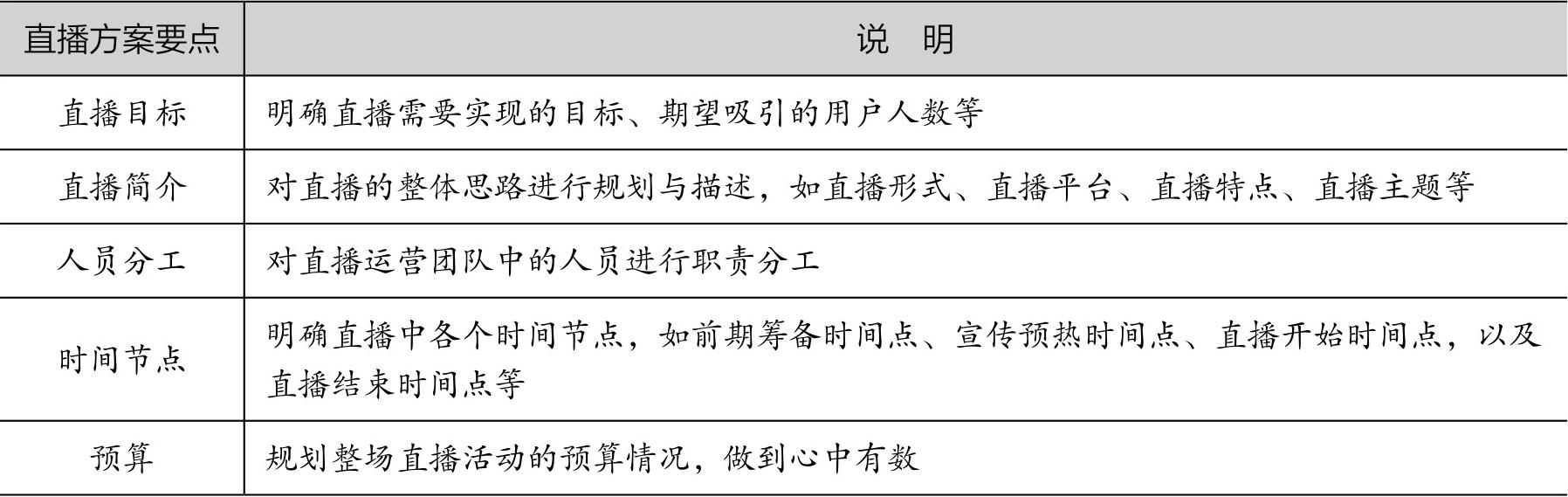 俗话说“不打无准备的战”,在开启一场直播之前,必须先写直播方案,将一些抽象思路具体化。如表1-1所示,直播方案要点包括直播目标、直播简介、人员分工等。