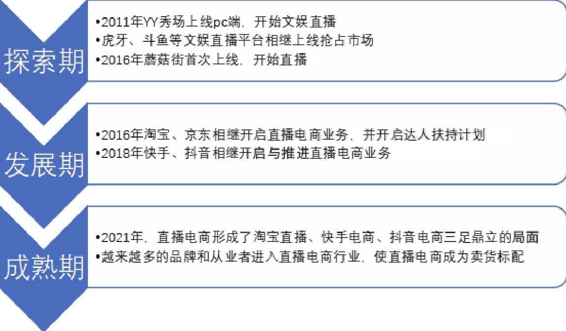 我国的直播电商起源于传统电商,是一种新业务模式,经过几年的沉淀已经日益成熟。如图1-4所示,直播电商经过了探索期和发展期,来到了成熟期。