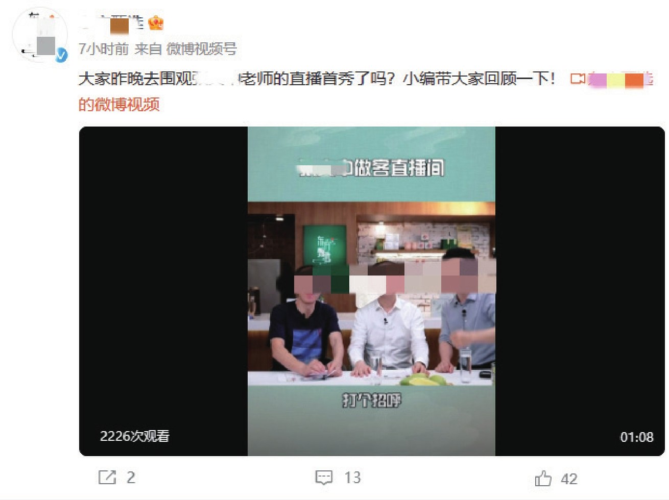 流量是直播电商的基础条件之一,只有无限放大直播的影响力,才有可能吸引到更多的用户关注直播。因此,即使是在结束一场直播后,也可以将直播进行二次传播,放大直播效果。例如,很多主播、商家会将直播录制成视频,分享在各大社交平台,其目的就是再次传播。图1-12为某直播账号将录制的直播内容分享在新浪微博的截图。
