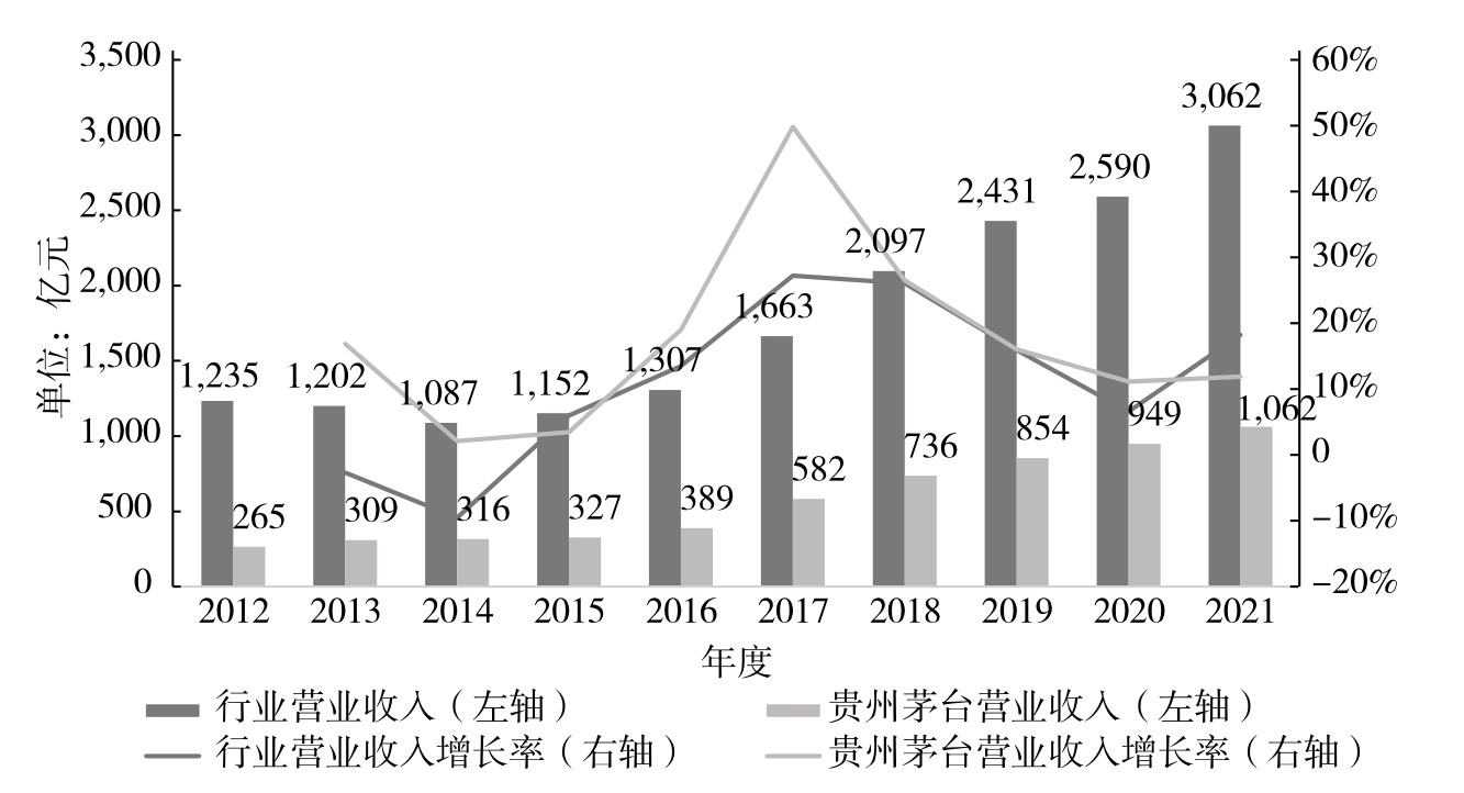 图2-2 2012—2021年白酒行业与贵州茅台营业收入情况