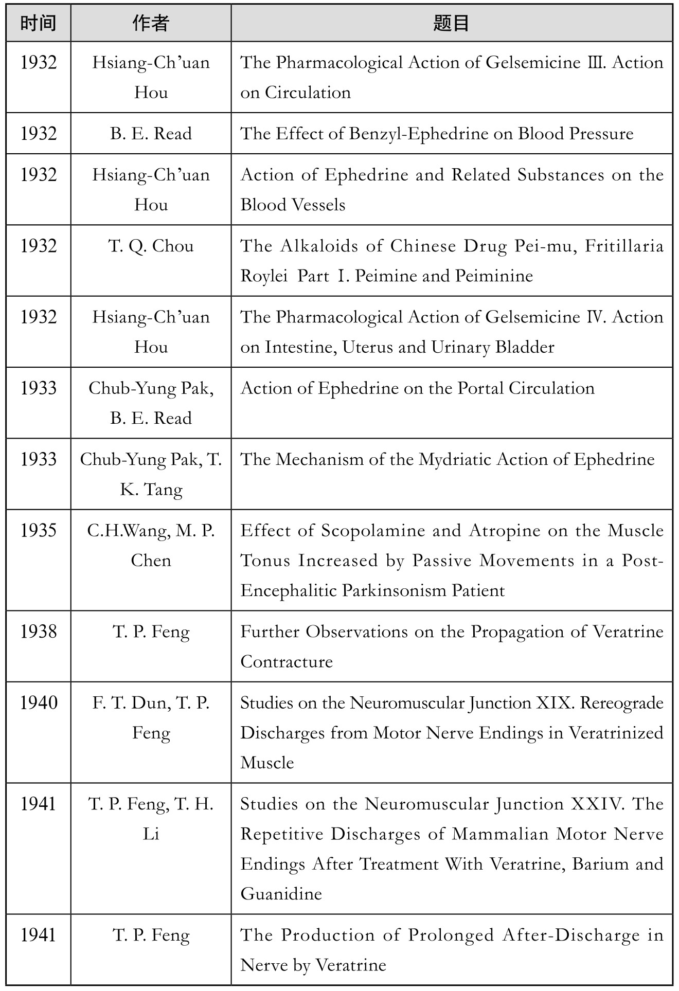 1923—1924年,伊博恩赴耶鲁大学深造,获得药理学博士学位,且在芝加哥大学进修病理学,1925年返回北京协和医学院,接替史米特任药理系主任。在他的带领下,协和药理系在1927—1933年间发表了10余篇有关麻黄素及其相关化合物的药理研究论文。伊博恩还先后与林巧稚、赵承嘏、冯志东、朴柱秉等人研究了其他中药的药理特性,使协和的中医药研究名噪一时。(表1.7.1)