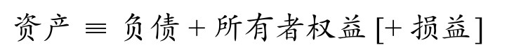 恒等号的左侧说明资产的构成和去向,包括银行账户有多少钱、有多少固定资产、花了多少成本及费用等;恒等号的右侧说明资产的来源,包括负债(Liability)、所有者权益(Equity)和损益。负债是指欠别人(银行、交易对方等)多少钱,所有者权益是指股东拥有多少钱,损益是指公司经营活动导致收入和成本(及费用)间的差值形成的盈利或亏损。