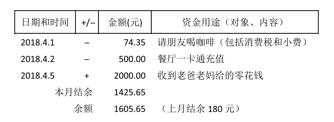 货币的流通使用,包括买卖、转账等,都属于交易(Transaction,经常简写为Tx)行为。把每次交易行为的详情记录下来,称为记账(Bookkeeping,或称为簿记)。最简单、直观的记账方式为单式记账法,就是客观地记下何时谁花了多少钱,购买了谁的什么东西等,如图1.5所示,俗称“流水账”,以便事后进行汇总、统计、分析,准确地掌握收入、支出的情况。最朴素的记账方法是站在自身的角度,以自己为交易的一方,只需记录日期和时间、资金流向(收入或支出)、金额、交易对象、交易内容(可细化物品组成清单、单价和数量)。