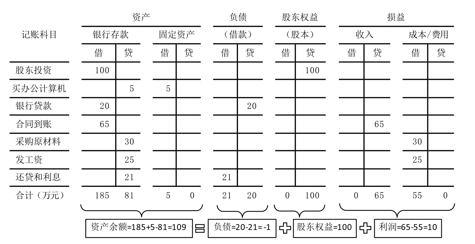 例如公司开张购买了一批办公计算机,花了5万元,此时应在资产中的银行存款的贷方记5万元,因为钱减少了,同时资产中的固定资产的借方记5万元,因为固定资产增加了,两者相抵,公司总资产没有变化;又例如公司为了开拓业务的需要,向银行贷款20万元,则应在资产的银行存款的借方记20万元,在负债的贷方记20万元,因为虽然银行存款多了,总资产看上去增加了,但股东的权益并没有增加,多出来的钱是借来的,总有一天要还的;再例如公司签了一个合同,到账65万元,应在资产的银行存款的借方记65万元,同时在收入的贷方记65万元。