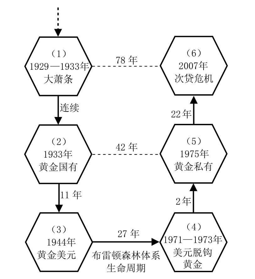 如果将这些事件就时间线、事件主角关联性、严重性等进行梳理,如图1.8所示,则可以看到:近现代国际金融秩序动荡不断,负面能量的积累最终形成周期性爆发的经济危机,导致人类社会的严重倒退;金融寡头把持的执政当局可以“朝令夕改”,手握强权“任性”修改规则,单边干预的痕迹明显,恣意掠夺弱势民众的财富;黄金美元也好、石油美元也罢,都是为一小撮金融财团利益最大化服务的,以保持其货币的国际化地位(可用来操纵利益收割),并未兼顾他国利害。