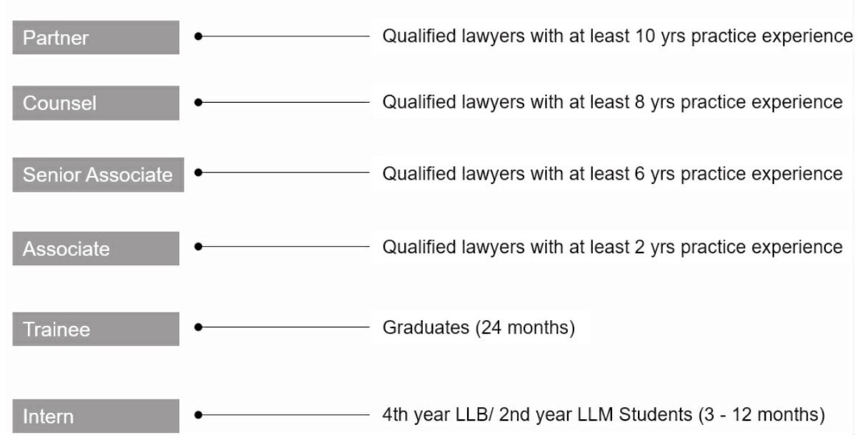 英国律所的职位和晋升途径比较清晰,按照顺序,一般可以分为实习律师(Trai-nee)、律师(Associate)、资深律师(Senior Associate)、顾问律师(Counsel)、合伙人律师(Partner)。