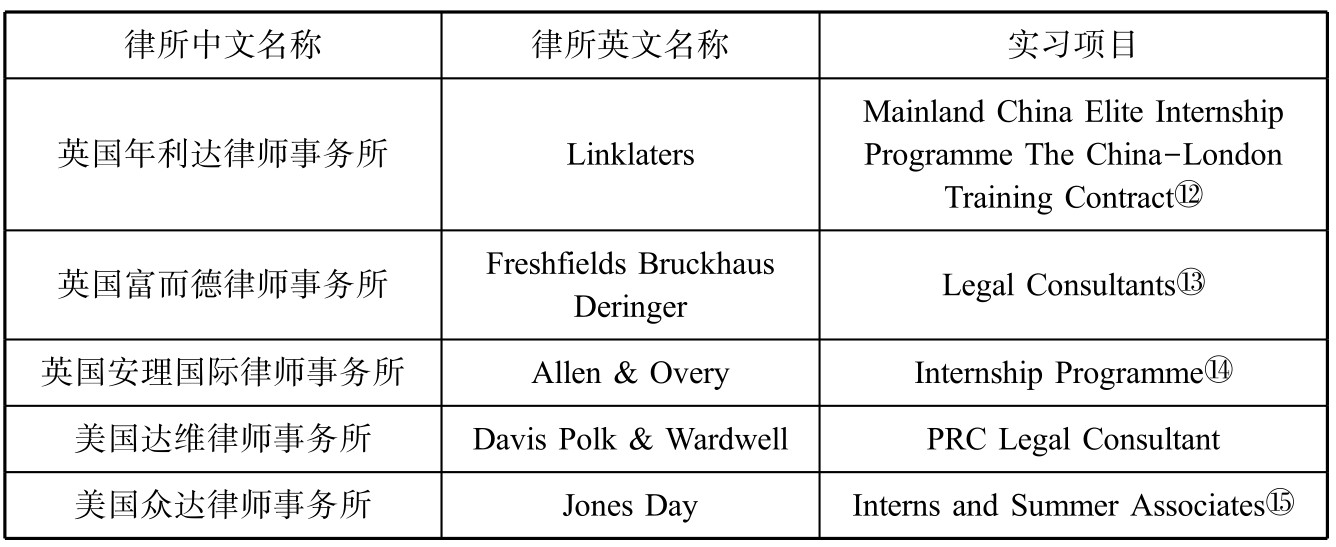 一般而言,外资律所针对中国背景学生都有设置相应的实习项目或实习计划,例如不少英国律所面向内地学生设置了校园招聘项目。这些项目不仅提供了绝好的实习机会,而且律所一般倾向于从实习项目的表现优异者中录用初级律师。此外,丰富的外所实习经历也能从侧面证明候选人了解和适应外资律所的工作氛围及强度,亦是简历上浓墨重彩的一笔。部分外资律所实习项目名录见表2。