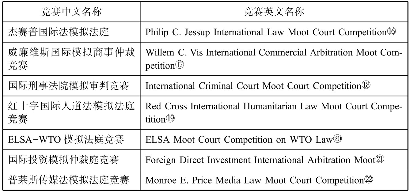 一方面,这些比赛的选手通常英文水平和综合能力突出,早期进入外资律所的中国法学生往往来自这一群体,而当他们成长为中高级律师后自然对于拥有类似经历的候选人更有好感。另一方面,候选人在这些比赛中锻炼出来的技能(包括写作和表达)可以很快转化并应用在工作中,也是颇受律所青睐的优势。以杰赛普模拟法庭为例,国内赛个人获最佳辩手(Best Oralist)前5名的选手过往可能获得赛事赞助商美国伟凯律师事务所(White & Case)的实习机会,且不少外资律所(Clifford Chance、Freshfields等)会主动联络表现优异者参加实习面试。部分模拟法庭竞赛名录表见3。