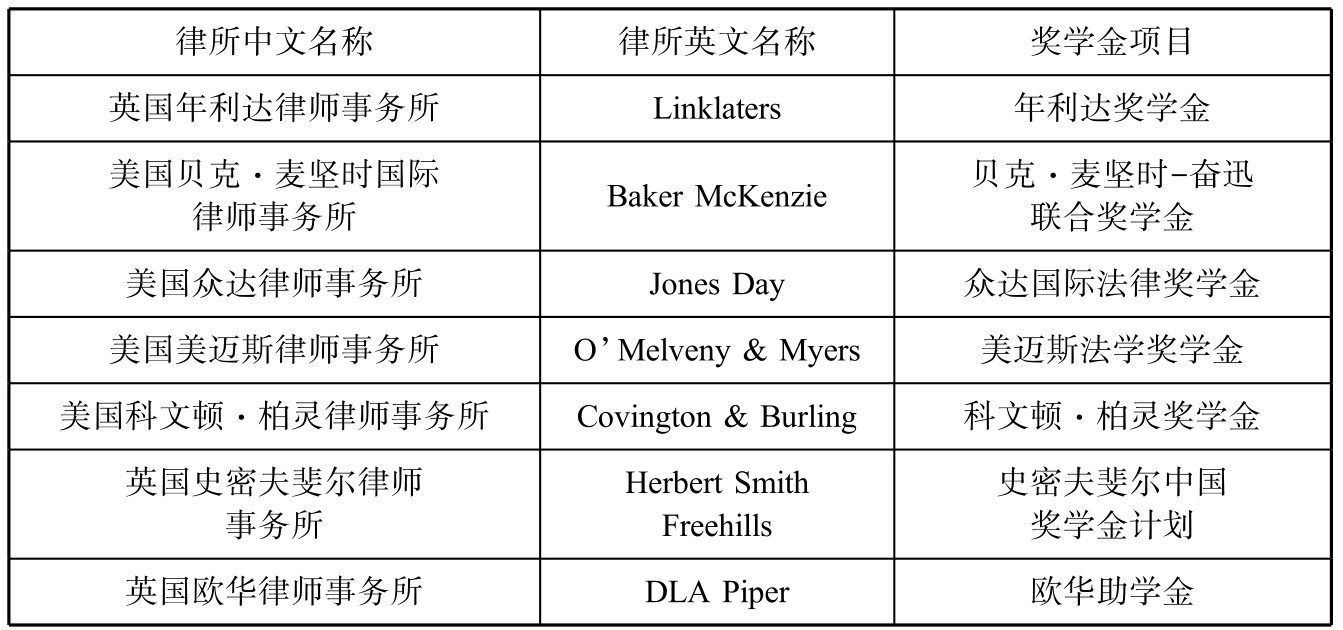 颇受追捧的外资律所奖学金项目也是打开求职大门的一块敲门砖,获奖者不但有机会在颁奖律所实习,而且也能结识更多同等优秀的同侪,一举两得。值得指出的是,不少外所奖学金的评选标准会或多或少纳入其招聘律师的要求,因此这也要求申请人提前根据其特点做好准备、做到有的放矢。个别奖学金会不时组织获奖者的聚会活动,例如美国美迈斯律师事务所(O'Melveny &Myers)每年均会邀请历届获奖者参加当年颁奖典礼,这也是拓展社交网络的途径之一。部分外资律所奖学金项目名录见表4。