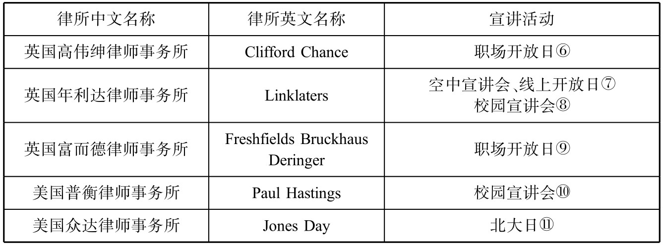 对于第一种进入路径即应届生招聘而言,不少外资律所会定期开展针对中国法学院学生或其他适格学生的各类宣讲活动,例如校园宣讲会、交流讲座、职场开放日、律所参观等活动。这些活动往往有负责招聘的合伙人律师或人事主管出席,除更直接和高效地认识和了解一家律所外,这种活动也提供了与未来面试官直接交流的机会。随着近年来外资律所对于顶级法学院优秀毕业生的“争夺”愈加激烈,为抢占先机,宣讲活动也不断由“宣传性”升级为各家律所初步筛选人才的重要方式。有的宣讲活动实质上也融入了招聘的环节,例如英国高伟绅律师事务所(Clifford Chance)的职场开放日活动和美国普衡律师事务所(Paul Hastings)的校园宣讲会活动,在介绍律所业务和分享职业发展规划经验外,亦提供现场面试实习岗位的机会。部分外资律所宣讲活动名录见表1。
