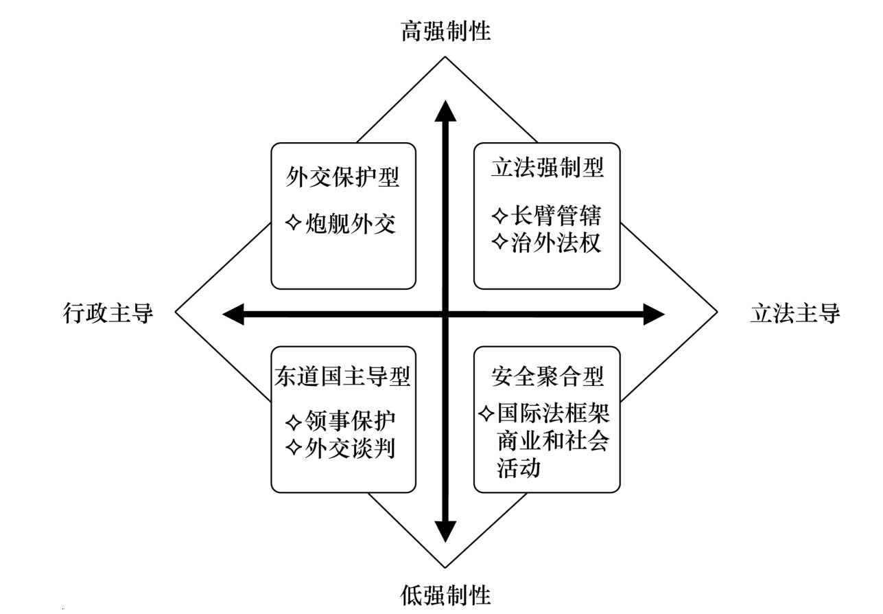 然而,即便通过国籍国、东道国与国籍国之间的关系、国家与非政府组织的分层等多个角度多种途径去处理这一问题,在现实中,仍要面临各国执行的能力、资源、意愿和具体落实政策的问题。各国禀赋差异,与东道国之间的关系各不相同,不同时期国际环境也有所影响,因此形成了海外利益安全治理的不同路径。肖河根据海外利益保护措施的强制性高低和行动主体将其分为四种基本类型,包括外交保护型、立法强制型、东道国主导型和安全聚合型。
