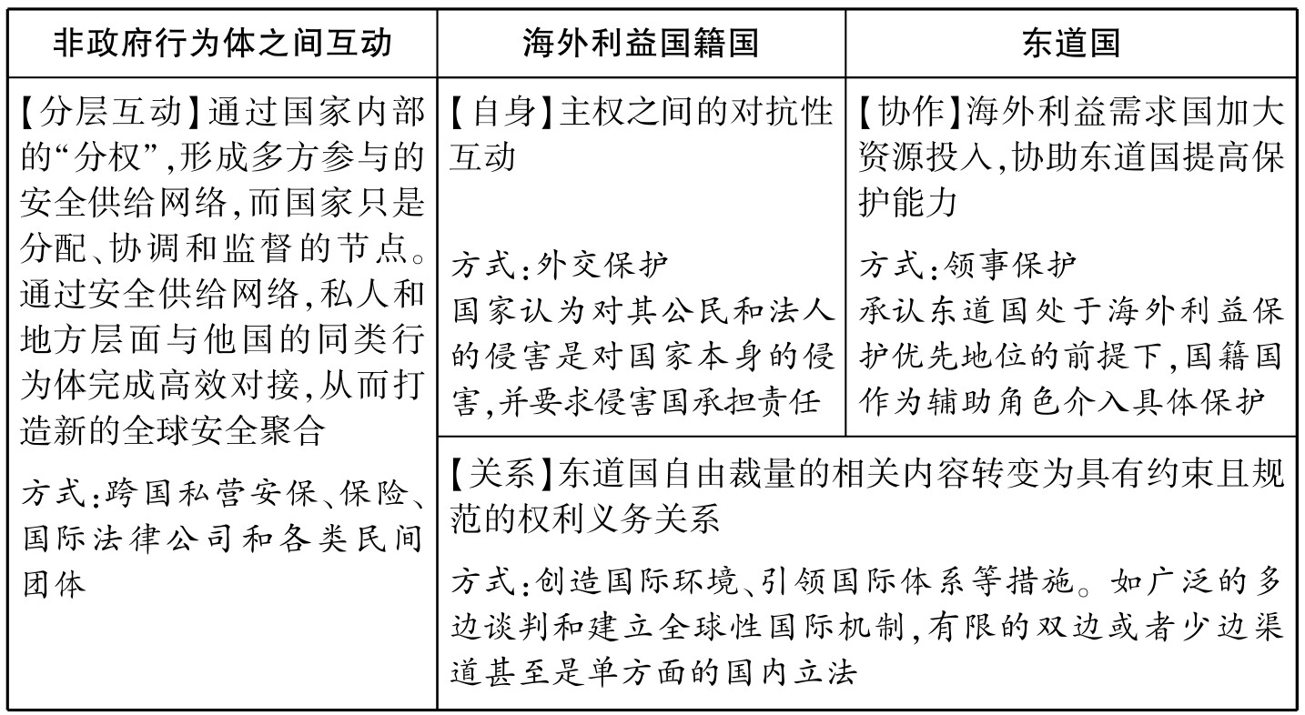 外交保护型是从国籍国出发的,具有较高强制性,遵循“主权对抗”的逻辑路径,其主要由行政部门自由裁量。另一种从国籍国角度出发的是立法强制型,以国内法代替行政自由裁量权,与第一种措施相比,该做法所采取的海外利益保护措施具有更高强制性,其往往涵盖“长臂管辖”或“治外法权”等内容。与此相反,东道国主导型则主要采取领事保护、外交谈判和其他低强制性措施,是从东道国的角度切入的。归根结底,东道国的意愿和能力决定其效果。安全聚合型是从非政府行为体互动角度展开的,是一种多元化、本地化的保护措施,其保护海外利益的主要方式是在具有较低强制性的国际法框架内进行商业和社会活动。