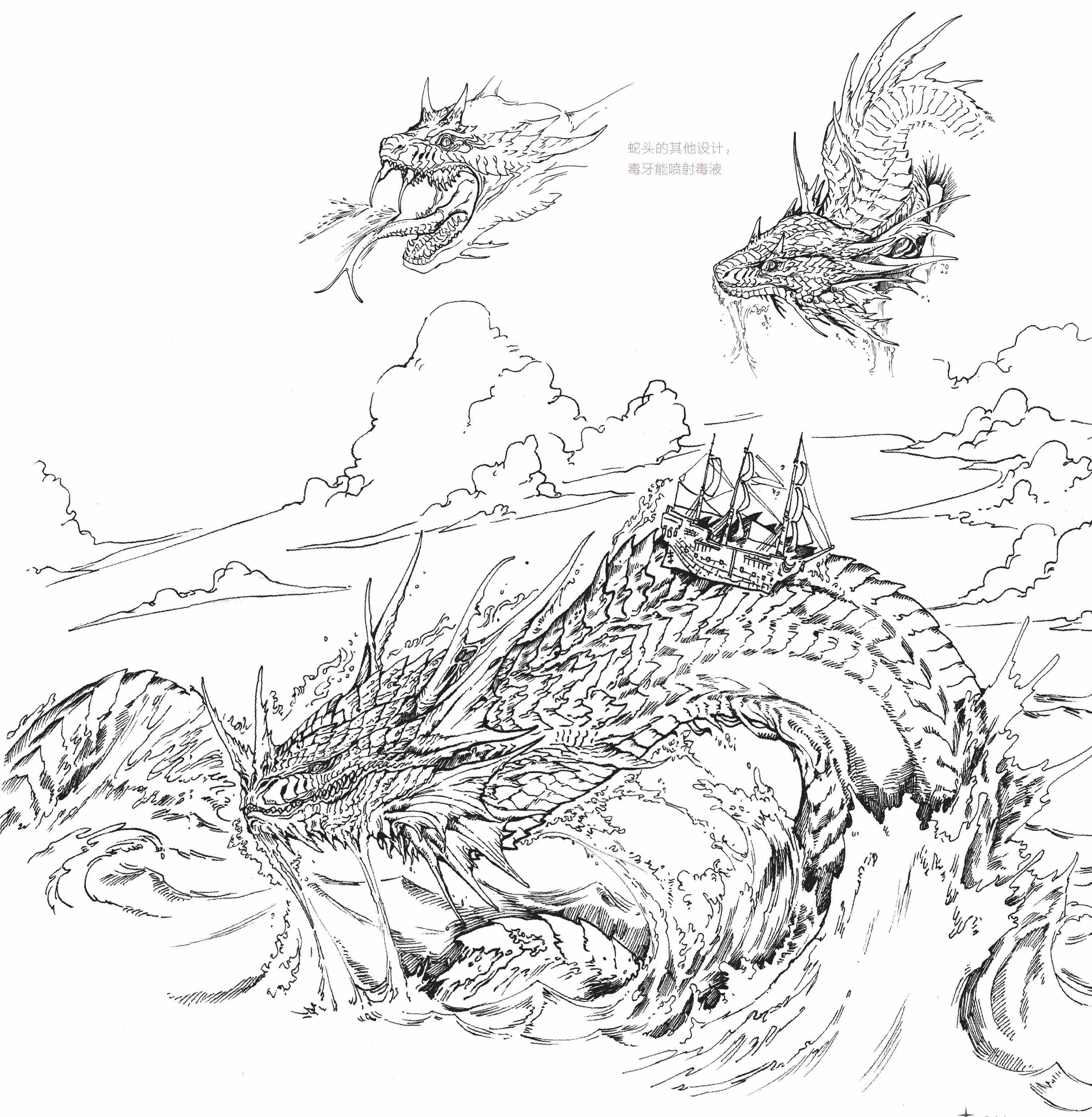设计耶梦加得的时候,以蛇类为原型,加上能体现其强大和巨大身体的结构。例如,巨大的鳍和帆状物分别在腮边和脊背处,在头上添加巨大的鳞片和角。在刻画鳞片的时候,可以添加更细腻的纹理和刻画一些石头似的质感,模拟旧化或被磨损的样子。为了突出令人害怕的特征,添加了两排尖牙和大毒牙。 MmcPzCE/1dw373vyO2QjLyVPkk4iia0RNUslXDrt1rEItEfMK1tHeR2ETZLevr3m