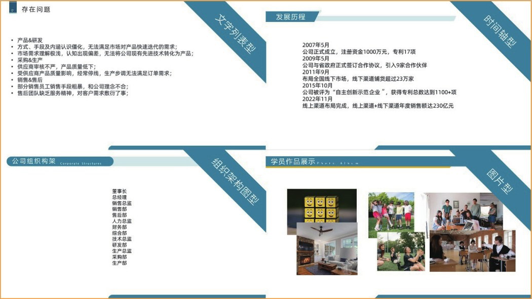 以上4种页面,可以分别命名为文字列表型页面、时间轴型页面、组织架构图型页面和图片型页面,如图4-5所示。
