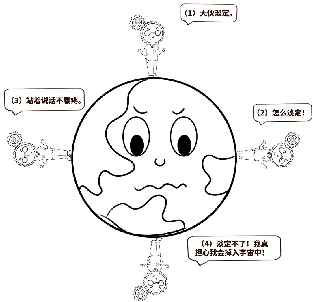大地是球形的,人该怎么办呢?我的意思是,站在上方自然不用担心,但侧面和下面的人怎么办?难道像壁虎一样吸附在地球上?