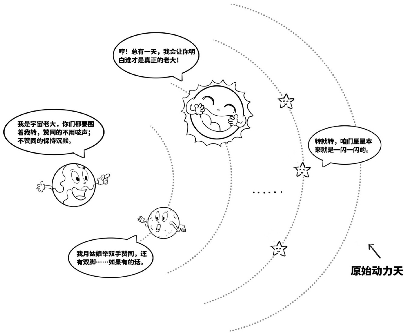 其实我们头顶上的天有很多层,如月亮天、太阳天、金星天、水星天、火星天、木星天、土星天,还有恒星天——所有恒星所在的天。恒星天之外还有原始动力天,它是宇宙运行的最终动力来源。所有的天层加上地球就是整个宇宙,地球就处在宇宙的正中心,因此叫“地心说”。