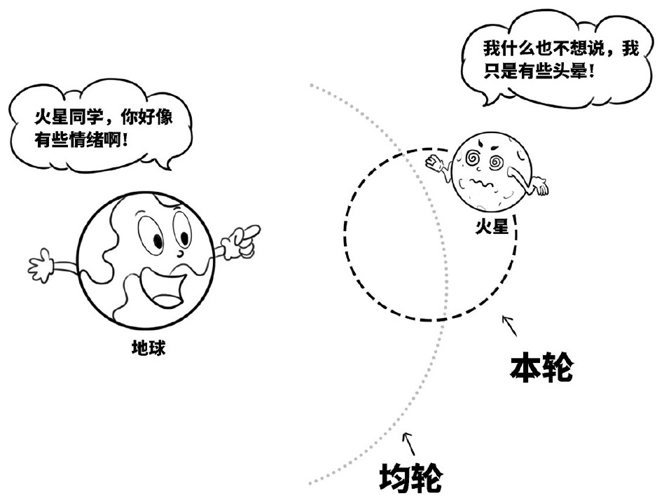 太阳、月亮和恒星依然绕着地球做圆周运动,但像火星、木星等一些“不听话”的行星,它们的运动要复杂一点。它们不是直接绕着地球转,而是绕着本轮转, 本轮的圆心绕着地球转——形成均轮。