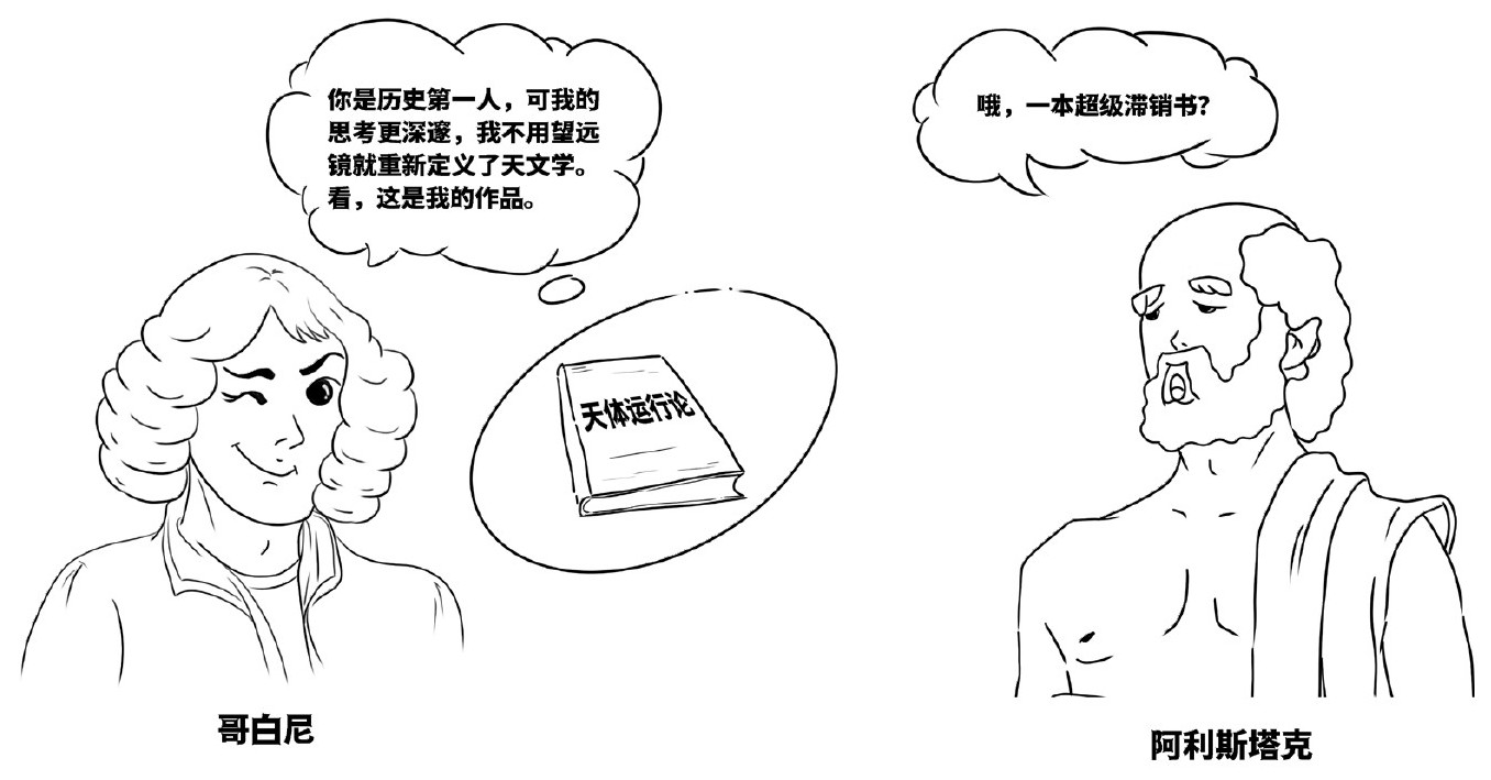 哥白尼比阿利斯塔克思考得要深。首先他证实了太阳确实比地球大,其次他初步解释了地球自转带来的种种悖论,更难能可贵的是,他在没有望远镜的条件下,重新定义了天文学,这些都被记录在他所著的《天体运行论》中。