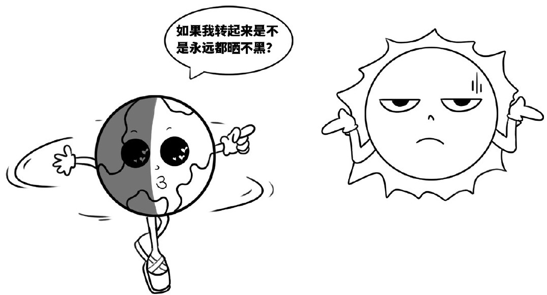 自转时,朝着太阳的一面就是白天,背着太阳的一面就是黑夜。