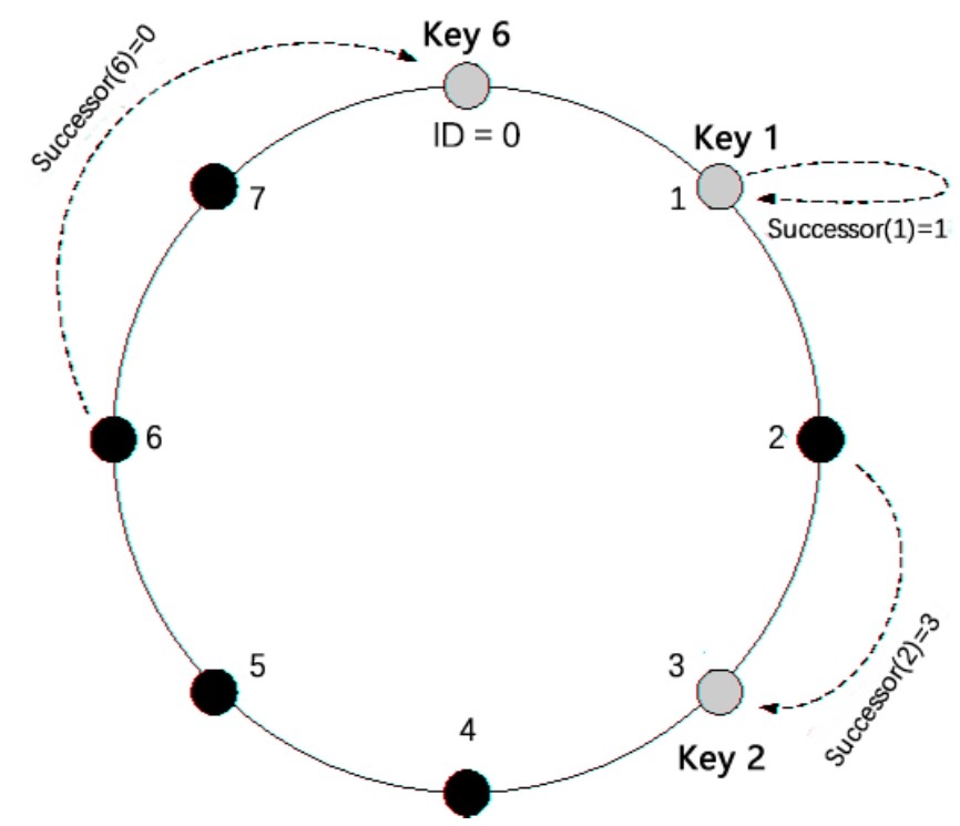 下面介绍一下Chord算法,这个算法与一致性哈希算法有相似的地方。我们在Chord算法中需要计算节点的ID和资源的ID,称为NID(Node ID)和KID(Key ID)。可以通过哈希IP地址获得NID,通过哈希资源文件获得KID。NID和KID都是m位的二进制数值,我们需要保证m足够大,使ID重复的可能性趋于零。