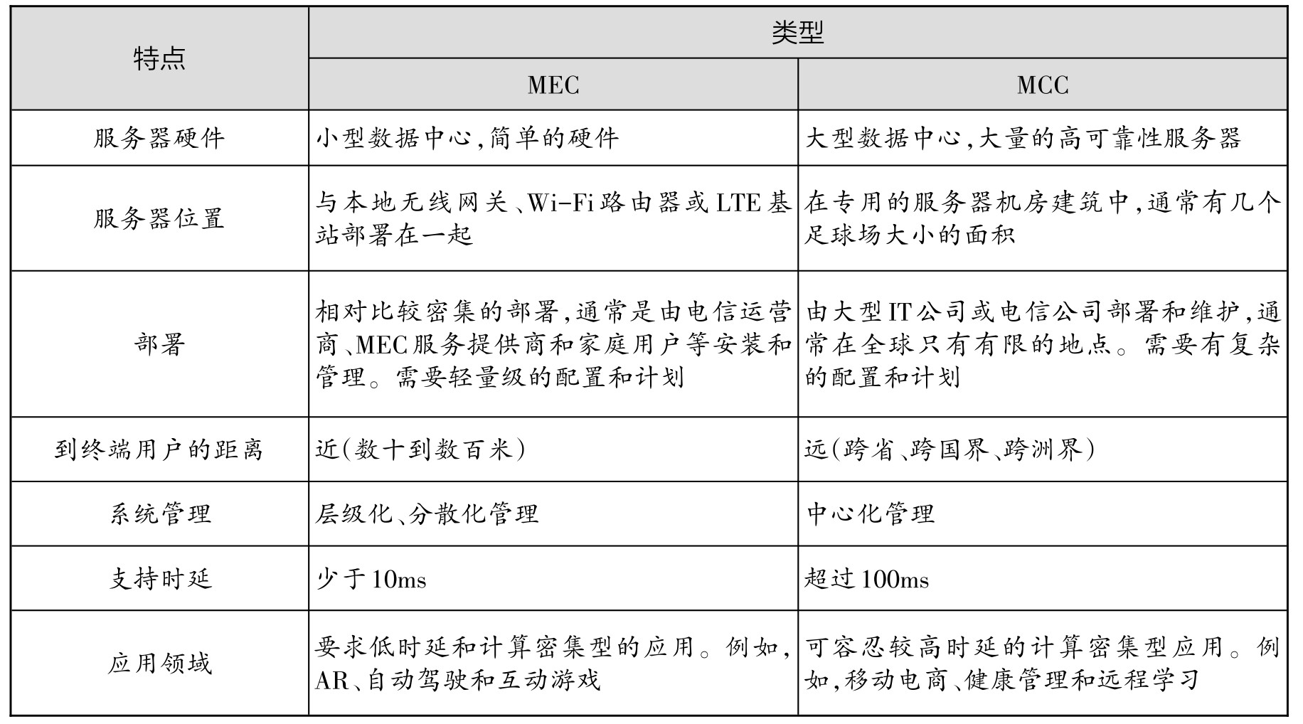 表1-4 移动边缘计算(MEC)和移动云计算(MCC)的区别
