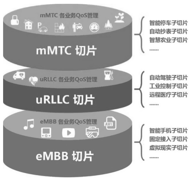 如图1-10所示,对于5G网络,主要分成了三种业务场景,或者说三种切片,分别提供不同的网络服务质量(QoS)。其中最基础的是eMBB(增强移动宽带)场景,即现在通用的移动通信设备和宽带服务,比如网页、互联网游戏、视频服务等应用。对应的是要求高速、大带宽的应用服务领域,最重要的指标是网络传输速度,对时延的要求不高。标准是在理想条件下连接带宽达到10~20Gb/s。从如今已经完成并冻结的R15标准来看,其主要的应用领域还集中在eMBB的场景。其实eMBB场景下的时延要求不高也只是相对的,由于AR/VR技术的应用也是放在eMBB这个场景切片的,所以其时延要求其实必须小于人的感知能力范围(20ms以内)。这个要求还是高出4G标准的水平的。