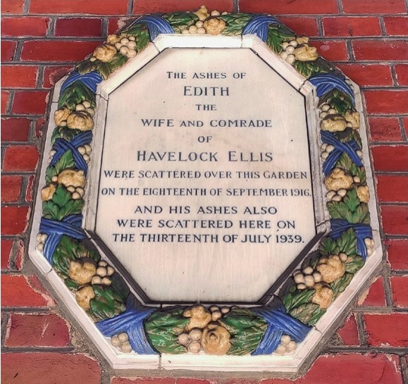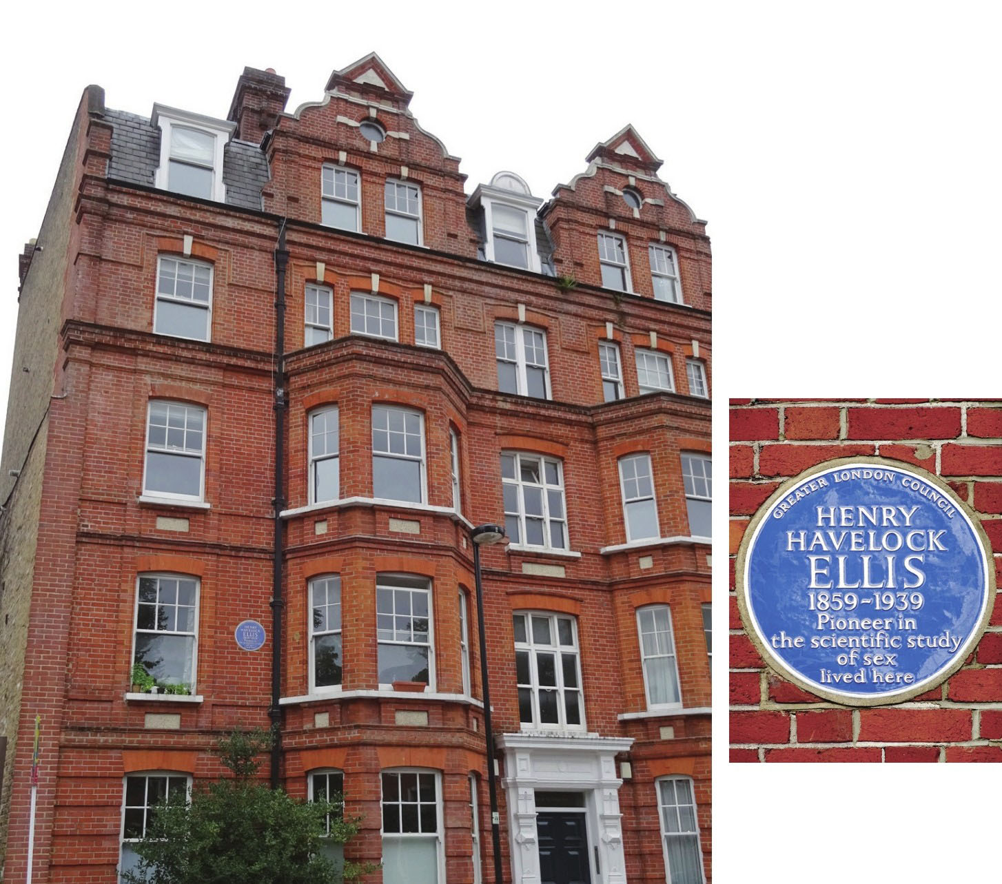 位于伦敦兰贝斯区多佛大厦的霭理士故居及故居外墙的纪念牌匾。在纪念牌匾上,霭理士被称作“性的科学研究的先驱”。