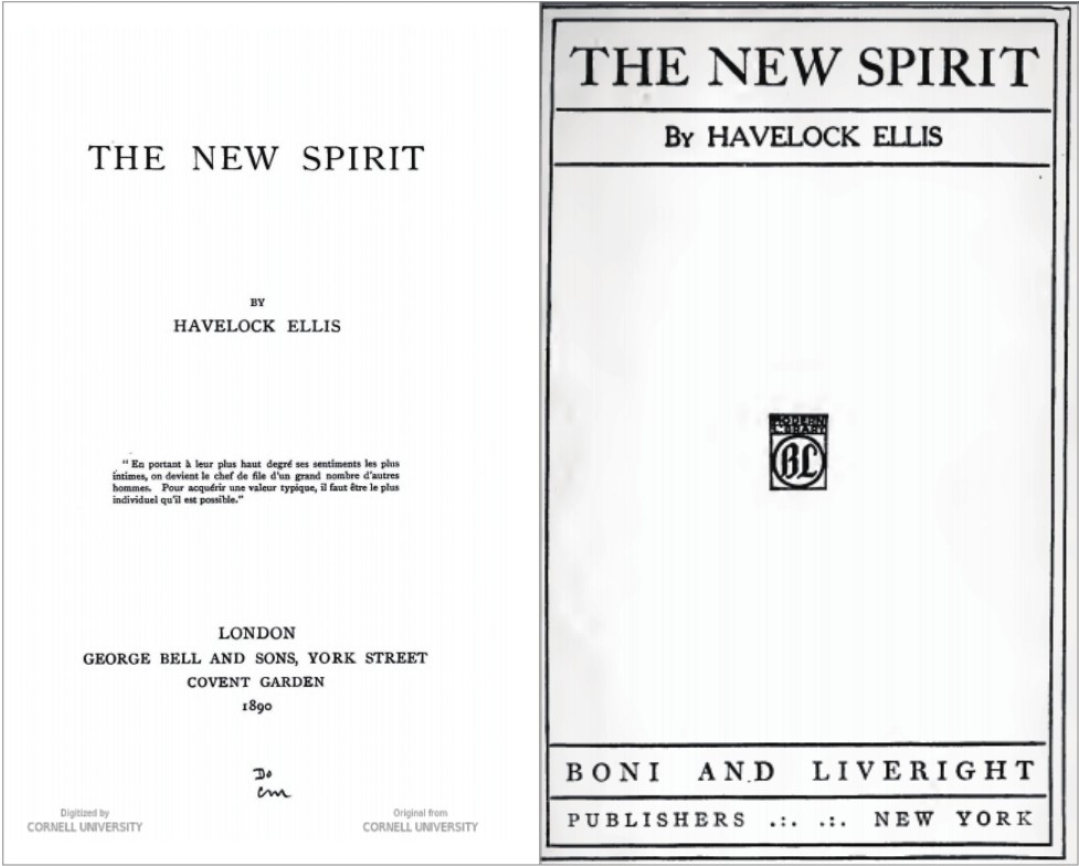 《新精神》(1890),英国版和美国版扉页。书中包括五篇文章,评论了狄德罗、海涅、惠特曼、易卜生及托尔斯泰,涉及人类学、社会学、政治学等内容。由于其中有大量关于“女性解放”的激进观念,坊间一度有传言说:《新精神》的作者是个女人。