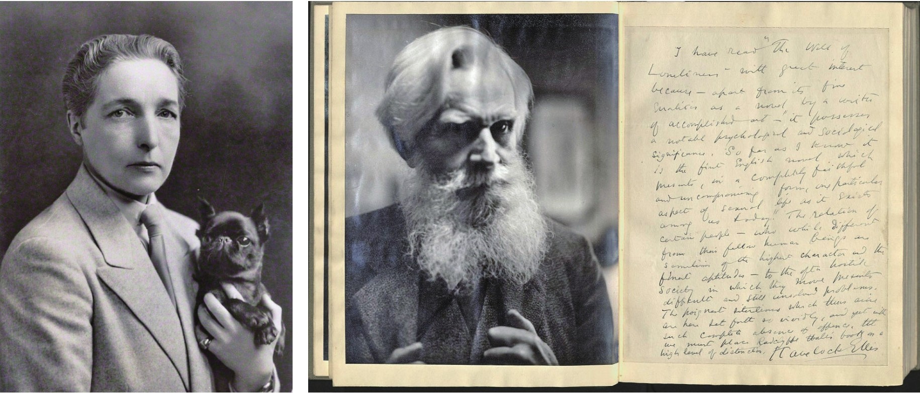英国作家、诗人霍尔(Radclyffe Hall,1880—1943)(左),小说《孤寂深渊》(打字机稿)中的霭理士照片与手写序言(右)。