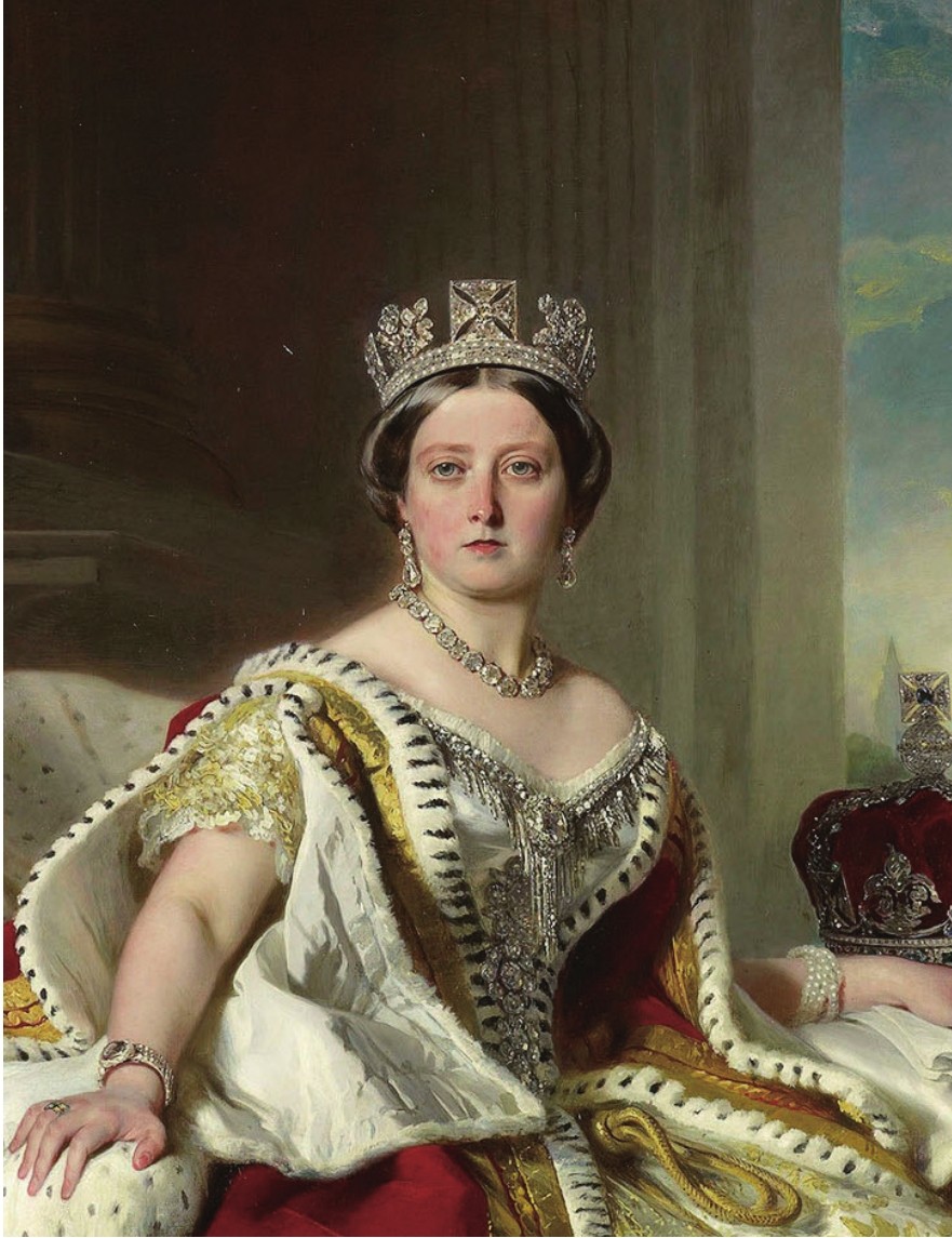 英国女王维多利亚(1819—1901)。维多利亚女王于1837年至1901年在位,统治时间长达63年7个月。在她统治期间,英国出现了科技、经济大繁荣,殖民地、财富大扩张,开启了英国历史上最强盛的“日不落”帝国时代。该画像画于1859年。
