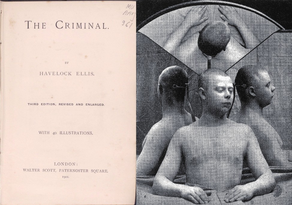 《罪犯》(1890)及其中插图。霭理士在书中探讨了先天因素对犯罪的影响,是对意大利犯罪学家龙勃罗梭(Cesare Lombroso, 1835—1909)所开创的犯罪人类学的追随和补充。该插图为埃尔米拉教养院一名囚犯的头部四视图。