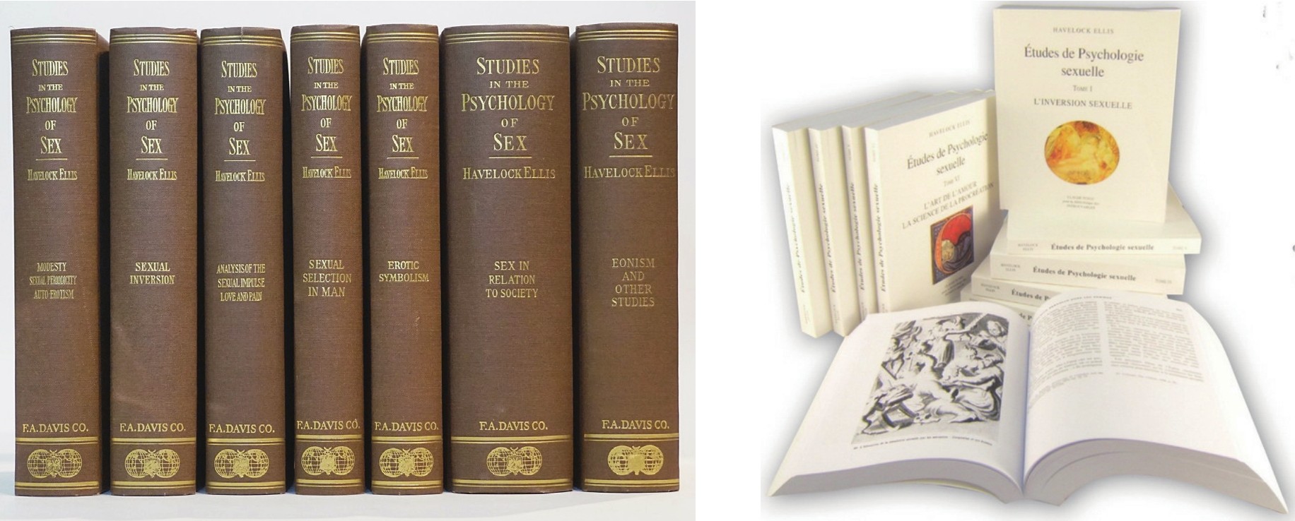 七大卷的皇皇巨著《性心理学研究录》(左侧为英文版,右侧为法文版)。第一辑《性的逆转》命运坎坷,先是于1896年在德国出版,后于1898年在英国正式出版,结果引起了保守势力的极大惊恐,导致出版商被告上法庭。但这无法阻止它被译为多国文字,传播至世界各地。第二辑至第六辑,也没能在霭理士的祖国英国首次出版,而是陆续于1899—1909年在美国首次出版。在1909年的第六辑《性与社会》出版之时,霭理士抄写下这样的句子:“天生了我要我做的工作现在是完成了。”1928年,霭理士又完成了第七辑的出版。这七大卷的鸿篇巨制是霭理士1933年出版的《性心理学》的基础。