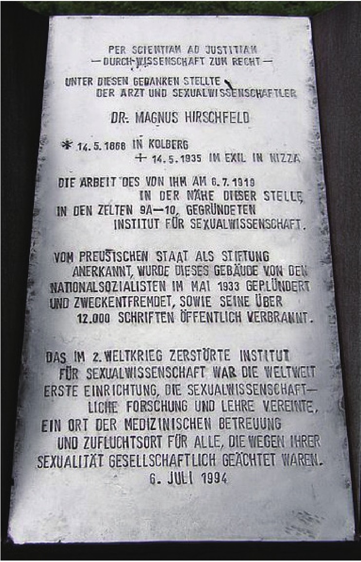 希尔虚弗尔德(Magnus Hirschfeld,1868—1935),德国医生、性学家。他被认为是20世纪最有影响力的性学家之一。他在柏林创立了性科学研究所(1919—1933),曾收藏了关于性的大量档案和图书,并提供教育服务和医疗咨询。他还号召成立了世界性改革同盟(1928—1933)。