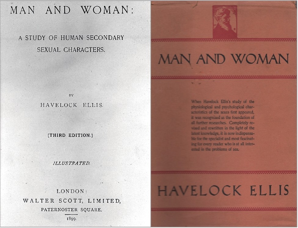 《男与女》(1894),英国版扉页和美国版封面。《男与女》从人类学和心理学的角度研究和讨论了男女之间在第二性征上的差别的意义,是霭理士后来的“性心理学研究”的序曲,被认为是一部“篇幅虽小,意义重大”的杰作。