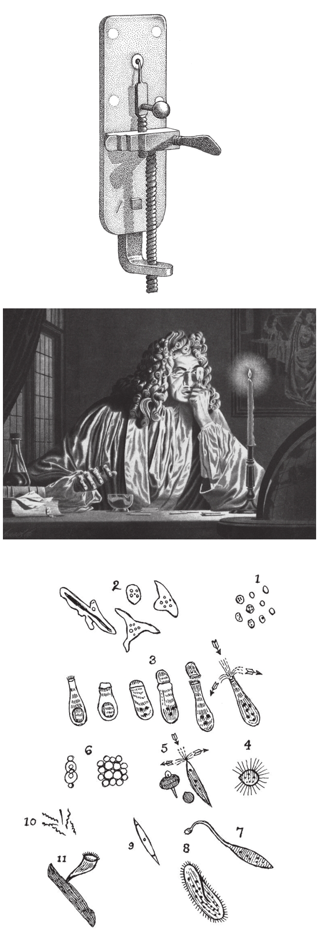 出生于荷兰的安东尼·菲利普斯·范·列文虎克(Antonie Philips van Leeuwenhoek,1632—1723)是位商人,也是位科学家。他早期对放大镜非常好奇,但苦于没有足够的资金购买。后来,他受到罗伯特·胡克《微物图志》的启发,通过对书中介绍的内容进行学习,经过模仿、制作、改良,打磨出了放大倍数约为300的显微镜。列文虎克将牙垢、污水、腐败有机物等不同来源的样本,放在显微镜下观察,他惊奇地发现视野里布满了大大小小、形态不一的微生物。原来,即使人们看不见微生物,也丝毫不会影响这些千姿百态的微生物的存在!列文虎克将它们命名为Dierken,意思是小动物,并将观察到的微生物用绘画的形式记录下来。这份实验观察记录被列文虎克寄到了英国皇家学会。他取得的成果在学术界引起了巨大的轰动,这是人类首次观察到微生物,也是人类首次观察到细菌。