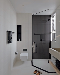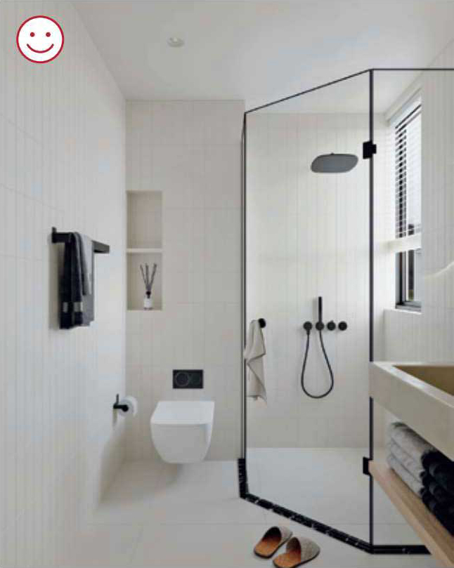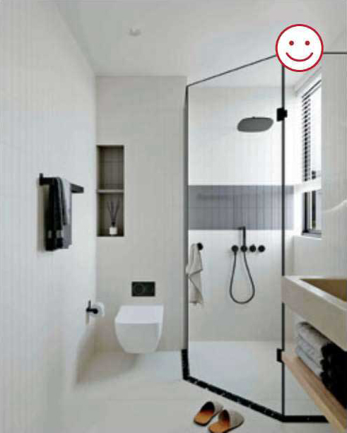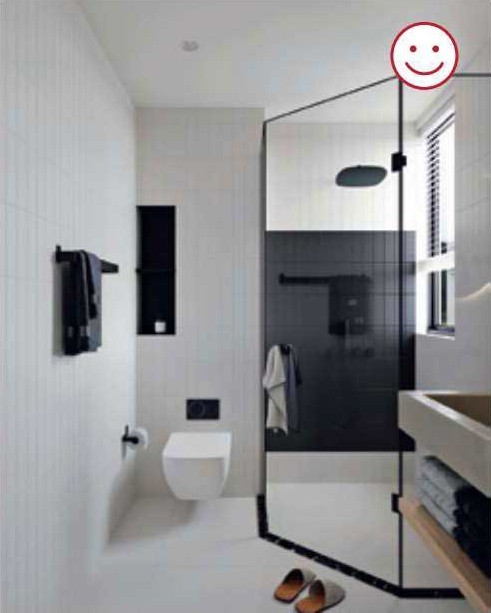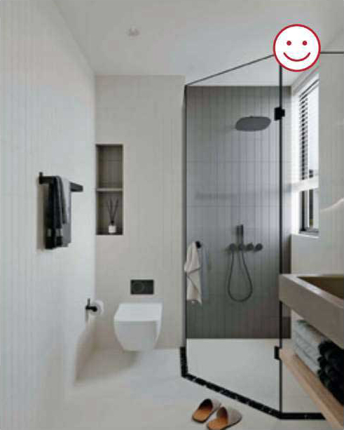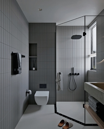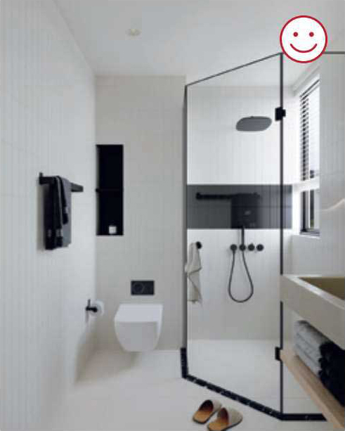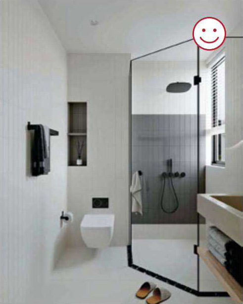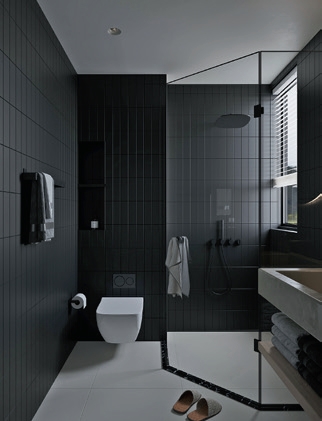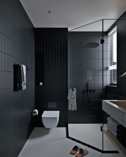 在这个约 4m 2 的卫生间,我们来对比一下不同明度的瓷砖带来的效果。在铺贴黑色瓷砖的卫生间里待着,像是受到惩罚被关在了小黑屋。随着瓷砖颜色亮度的提升,室内的光变多了,更显宽敞明亮,心胸也开阔起来