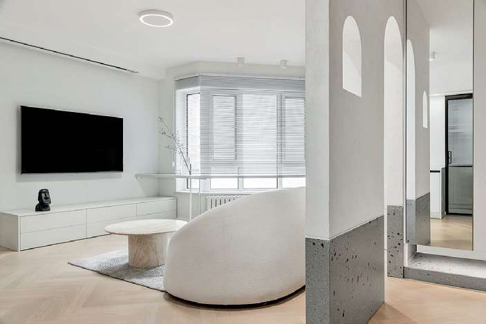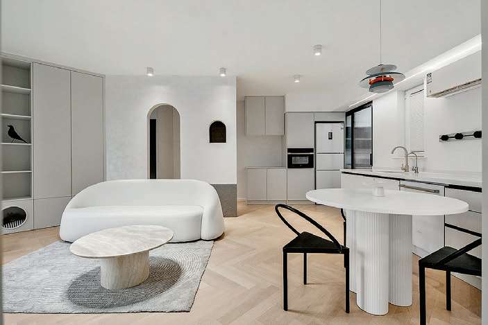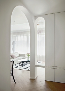地板为亮奶油咖色,使房间脱离了沉闷感,搭配大量的圆弧造型,颜色和造型的语言一致——柔和、顺畅,室内装饰物整齐划一