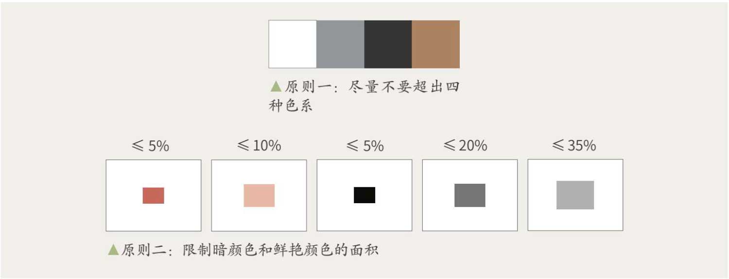 如果你谨慎,决定选择一条安全平坦的大道,那么请遵守两个原则:原则一,尽量不要超出黑、白、灰、咖四种色系;原则二,限制暗颜色和鲜艳色的面积。这样能确保最后呈现的效果万无一失,这也是很多室内设计师善用的配色方式。
