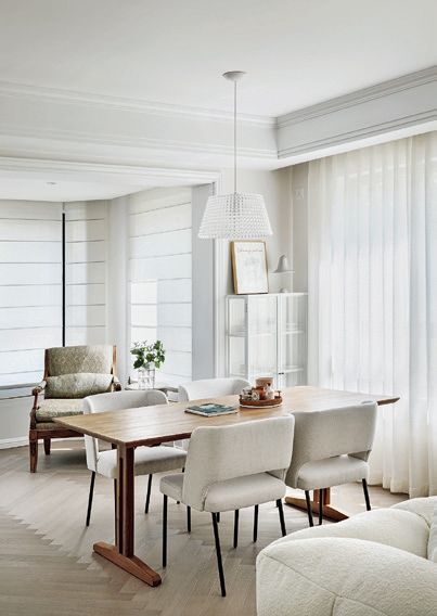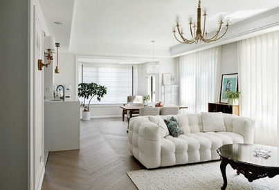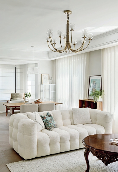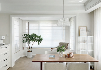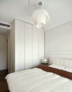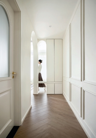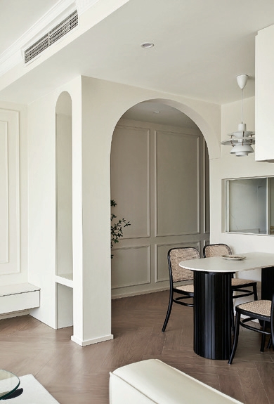 室内用了两种白色,墙面、顶面的乳胶漆是纯白色,定制家具为米白色,色相接近,有层次感。米白色的定制家具和咖色地板是同一个色系,色彩过渡柔和。在整套法式奶油风格的家中,我们找不到任何危险的颜色,彼此相融,浑然一体