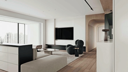 电视柜、沙发、吧台处用了小面积的黑色(不超过 10%),用色十分克制。室内为大面积白色和咖色,整体透露着简洁雅致的气质