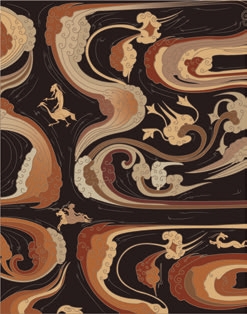汉代绘有云气纹的器物大量涌现,以云为轮、以星空为地的人驾龙车、虎车、鸟车升天的画面,遍布于两汉画像砖、漆器、丝织物上。崇尚神灵、渴望长生的汉人给云加上俏皮的“小尾巴”,把灵动的气注入云纹中,赋予了云气纹以生命的活力,使其充满了节奏感和韵律感。汉代图案的特点是布局紧密,构图更多采用交缠与勾连的骨式构成,间隙及周围再布满动物纹、植物纹、云气纹等。