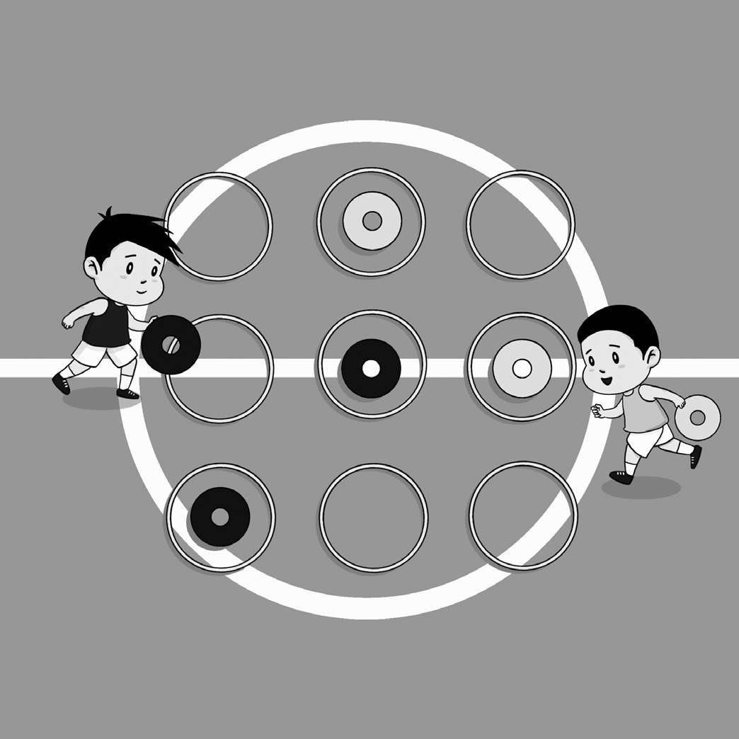 组织形式: 用9个敏捷圈摆成正方形的棋盘,以标志盘为棋子。3~5人为一组,持一种颜色的标志盘,两组进行比赛。以接力的形式进行下棋。