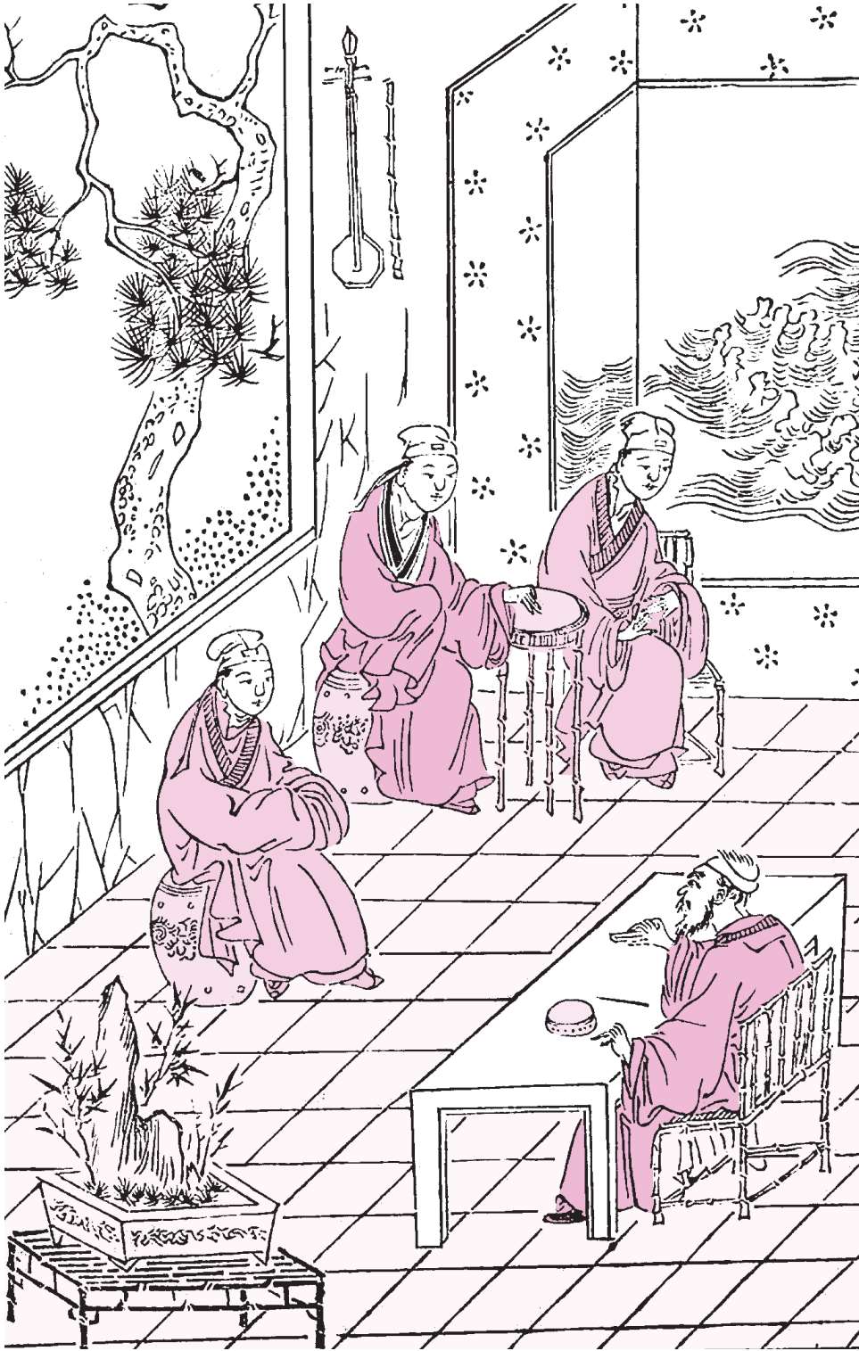 (见介)原来是陈、吴二位相公,老汉失迎了!(问生介)此位何人?(末)这是敝友河南侯朝宗,当今名士,久慕清谈,特来领教。(丑)不敢,不敢!请坐,献茶。(坐介)(丑)相公都是读书君子,甚么《史记》《通鉴》,不曾看熟,倒来听老汉的俗谈。(指介)你看: